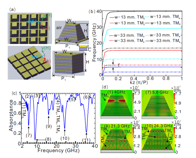 龙昌博士和华中科技大学陈林老师课题组合作撰写的研究论文“Ultra-wideband microwave absorber by connecting multiple absorption bands of two different-sized hyperbolic metamaterial waveguide arrays”被Nature出版集团出版的期刊Scientific Reports(影响因子: 5.578)正式发表(2015, 5, 15367; http://dx.doi.org/10.1038/srep15367)。在该论文中,我们基于双曲超材料单元的慢光效应,设计并组合了两个不同尺寸的锥形双曲超材料波段构成的超宽带吸波超材料,其吸收带宽涵盖2.3-40GHz。