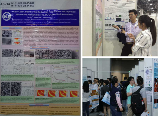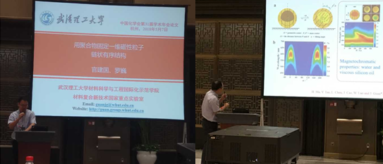中国化学会第31届学术年会于2018年5月5-8日在浙江杭州国际博览中心举行。本届年会以“构建化学新时代”为主题,包括49个分会及多个学术论坛,13000余名科研工作者参会。我研究组赵素玲教授、罗明助理研究员、罗巍博士、刘云博士生、卞娟硕士生参加了该会议。会议期间,罗明助理研究员代表官建国教授在“纳米生物效应与纳米药物化学”分会场作了题为“微纳米马达:主动给药载体?”的邀请报告,罗巍博士代表官建国教授在“纳米材料的合成与组装”分会场作了题为“用聚合物固定一维磁性粒子链状有序结构”的邀请报告,刘云博士生张贴了题为“Fe3O4/C核壳纳米片的低成本制备及其增强的微波吸收性能”的墙报。我代表团成员在报告及墙报交流中,积极与专家学者们展开学术讨论,虚心学习新方法、新理论,同时推广实验室先进理论与方法,并与有合作意向的学者建立联系。