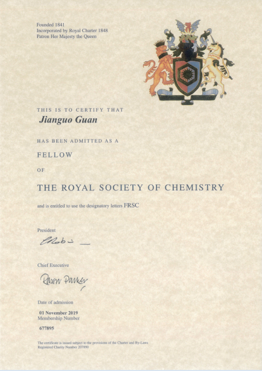 日前,研究组官建国教授收到英国皇家化学学会颁发的证书,当选为英国皇家化学学会会士(Fellow of the Royal Society of Chemistry,FRSC)。