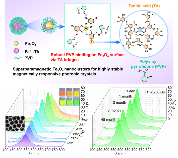 原文摘要如下:High stability of magnetically responsive photonic crystals (MRPCs) with superior optical properties in complex environments is important for practical applications but still remains a challenge. This work demonstrates a polyphenol-mediated strategy for synthesizing size-controllable superparamagnetic magnetite (Fe3O4) colloid nanocrystal clusters (CNCs) that can be stably dispersed in various polar solvents to form MRPCs with brilliant structural colors for a long term. As tannic acid (TA) functions as a linker to robustly bind polyvinylpyrrolidone (PVP) chains to Fe3O4 surfaces, the MRPCs could maintain nearly constant diffraction wavelength and high reflectance for up to four years. The strong coordination between TA and Fe3+ inhibits crystal growth, ensuring the small primary crystal size and superparamagnetism of Fe3O4@TA-PVP CNCs. Partial oxidation of TA accelerates the crystal nucleation and growth, reducing the overall CNC particle size, which can be utilized for controlling the particle size. Additionally, enhancing the dissolution of PVP before the solvothermal reaction improves the size monodispersity of the products, making the as-constructed MRPCs ideal for practical applications in color display, sensors, anti-counterfeiting, and camouflage. The Fe3O4@TA-PVP CNCs with high stability and versatility for surface-functionalization are also promising for magnetic resonance imaging, targeting drug delivery, recyclable catalysis, and magnetic nanomotors.