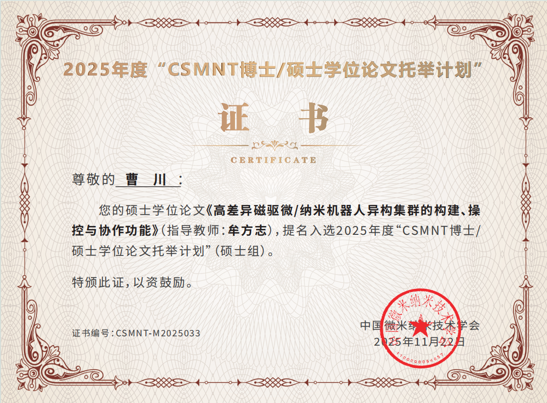 近日,中国微米纳米技术学会公布2025年度“CSMNT博士/硕士学位论文托举计划”遴选结果。研究组曹川同学(导师:牟方志研究员)的硕士学位论文《高差异磁驱微/纳米机器人异构集群的构建、操控与协作功能》提名入选该计划。