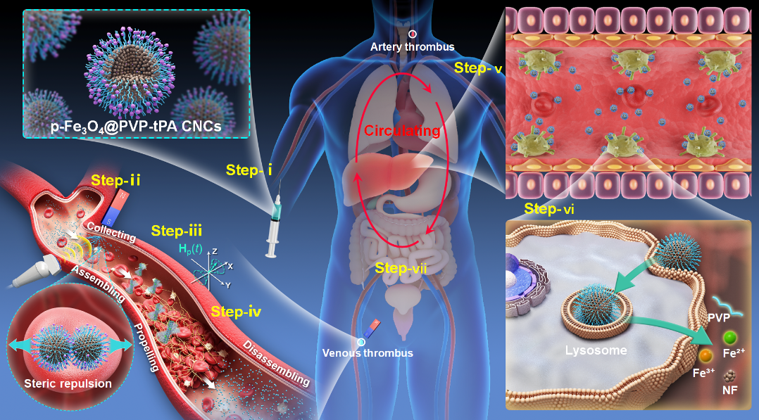 原文摘要如下:Magnetic micro/nanorobots hold promise for targeted thrombolysis, yet face challenges of rapid immune clearance and poor metabolic degradability, often necessitating invasive localized deployment and retrieval. Here, we present safe and versatile systemic-to-local thrombolysis enabled by magnetic nanorobots constructed from polyvinylpyrrolidone-shielded porous Fe3O4 colloidal nanocrystal clusters (p-Fe3O4@PVP CNCs). This design elaborately harmonizes prolonged circulation, strong magnetic responsiveness, and rapid biodegradability. The stealth PVP coating allows tPA-loaded CNCs to be systemically injected, achieving prolonged blood persistence. The p-Fe3O4 nanocrystal-cluster core provides a strong collective magnetic moment necessary for sequential magnetic collection (via gradient field H) and actuation into navigating nanorobots (via precessing field Hp(t)) for targeted thrombolysis. After therapy, the disassembled CNCs, owing to their porous structure and ultrasmall primary nanocrystals (<5 nm), undergo rapid lysosomal degradation and are cleared primarily via the liver–bile–intestine axis, resulting in no long-term toxicity. This platform overcomes key translational challenges for nanorobotic thrombolytic therapy.
